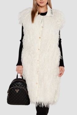 Чорний жіночий рюкзак Giully Flap Backpack від Guess - стильний і практичний аксесуар, виготовлений з екологічно чистої шкіри. Рюкзак закривається на блискавку, має велику зовнішню кишеню на блискавці та захисні ніжки для захисту нижньої частини. Всередині є одне просторе відділення, кишеня на блискавці та дві кишені для дрібниць. Для захисту рюкзака під час зберігання в комплекті є мішечок для пилу.