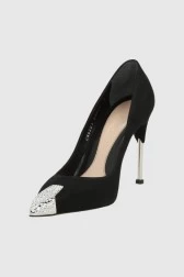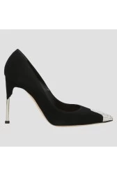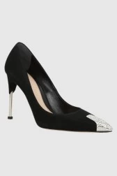 Туфлі на шпильках Alexander McQueen чорного кольору, виготовлені із замшевої шкіри теляти. Загострений ніс прикрашений кристалами Swarovski. Круглий металевий каблук сріблястого відтінку. Шкіряна підошва бежевого кольору.