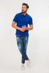Чоловіча сорочка-поло EMPORIO ARMANI синього кольору. Дві білі смужки на комірі. Невелика аплікація логотипу на грудях зліва. Ребристий комір і кінці рукавів.
