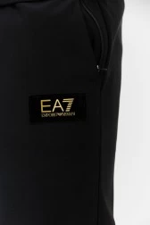 Dresowe spodnie EA7 EMPORIO ARMANI w kolorze czarnym. Z przodu aksamitna aplikacja z logo w kolorze złotym. Po bokach kieszenie z krytym suwakiem. Elastyczny pas, dodatkowo ściągany trokami ze złotymi ogranicznikami. Nogawki wykończone ściągaczami z gumy.