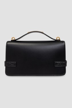 На передній частині сумки домінує логотип бренду у вигляді великої літери "B" золотистого кольору, що надає їй виразного та впізнаваного вигляду. Золоті елементи оздоблення, такі як пряжки та деталі ремінця, гармонійно поєднуються з глибоким чорним кольором шкіри, створюючи цілісний та розкішний дизайн. Сумка також має елегантний нерегульований ремінець довжиною 100 см. Верхня частина сумки оснащена масивною ручкою для зручного носіння.