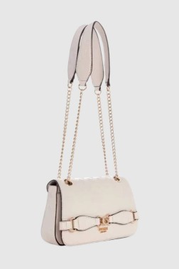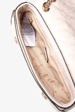 Бежева сумка Arlena з логотипом від Guess. Клапан на магнітній застібці, всередині одна кишеня на блискавці, одна кишеня для карток і шість відділень для карток. Мішок для пилу в комплекті.