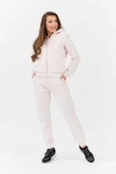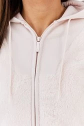 Плюшевий жіночий світшот рожевого кольору без ґудзиків. Невеликий вишитий логотип спереду. На спині аплікація з великим логотипом. Дві врізні кишені з боків. Капюшон на шнурку. Низ і рукава з ребристим подолом.