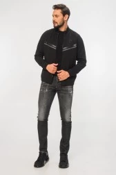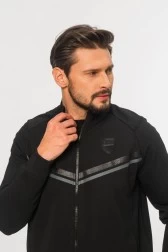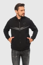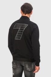 Чоловічий світшот EMPORIO ARMANI чорного кольору. Дві декоративні смуги на грудях: чорна парчева і сіра. На грудях зліва чорна аплікація з логотипом EA7. На спині велика аплікація з парчевою цифрою "7". Світшот на блискавці, з коміром-стійкою. Дві кишені на блискавці. Рукава з ребристими манжетами та широкою резинкою на подолі.