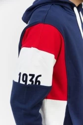 Бавовняний світшот EA7 EMPORIO ARMANI темно-синього кольору з білими і червоними вставками. На грудях білий принт "Olimpia Milano 1936". Спереду на стегні невелика аплікація з логотипом. На спині велика оксамитова аплікація біло-червоного кольору. На правому рукаві оксамитова аплікація темно-синього кольору. Спередувелика врізна кишеня. Капюшон на шнурку. Низ і рукава з ребристим подолом.