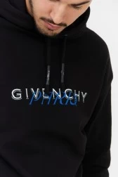 Чоловічий бавовняний світшот GIVENCHY чорного кольору з капюшоном. Логотип у біло-синьому кольорі спереду та ззаду. Капюшон зі шнурком. Низ і рукава оброблені ребристим подолом.