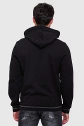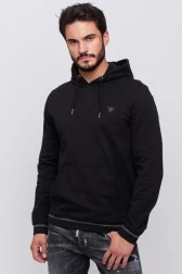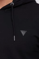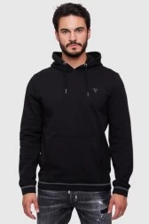 Чоловічий світшот GUESS з капюшоном чорного кольору. Трикутна аплікація логотипу чорного кольору зліва на грудях. Врізна кишеня на животі. Низ і рукава з ребристими манжетами.