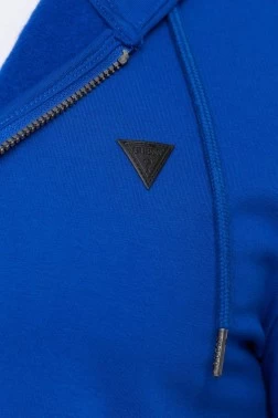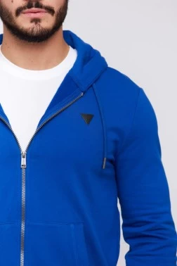Чоловічий світшот GUESS з капюшоном синього кольору. Трикутна аплікація логотипу чорного кольору зліва на грудях. Застібка-блискавка. Дві врізні кишені на животі. Низ і рукава з ребристими манжетами.