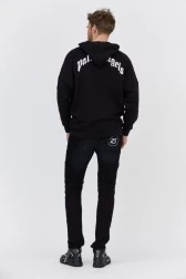Чоловіче худі чорного кольору з капюшоном. Білий принт спереду та велика накладна кишеня. Великий білий логотип на спині. Капюшон на шнурку. Низ і рукава оброблені ребристим подолом.