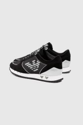 Жіночі кросівки EA7 EMPORIO ARMANI чорного кольору з елементами із замші та шкіри сріблястого відтінку. Аплікація логотипу сріблястого кольору збоку. Білий логотип на язичку. П'яткова стійка сріблястого кольору. Ніс вкритий чорною сіткою на сріблястому тлі. Чорні шнурки з логотипом сріблястого кольору. Підошва біло-чорного кольору.