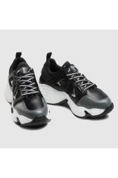 Жіночі кросівки EMPORIO ARMANI чорного кольору на білій суцільній підошві. Верх з різноманітними текстурами. Шкіряні елементи чорного і сірого кольору, чорна тканина і сріблясті вставки. Навколо п'яти пластикова стрічка з логотипом сірого кольору.