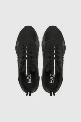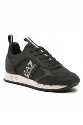 Czarne sneakersy z różowo-beżową podeszwą i złotym logo.