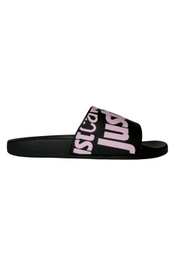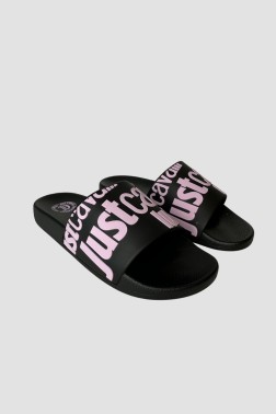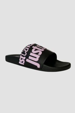 JUST CAVALLI Чорні шльопанці з фіолетовим логотипом Fondo Pool